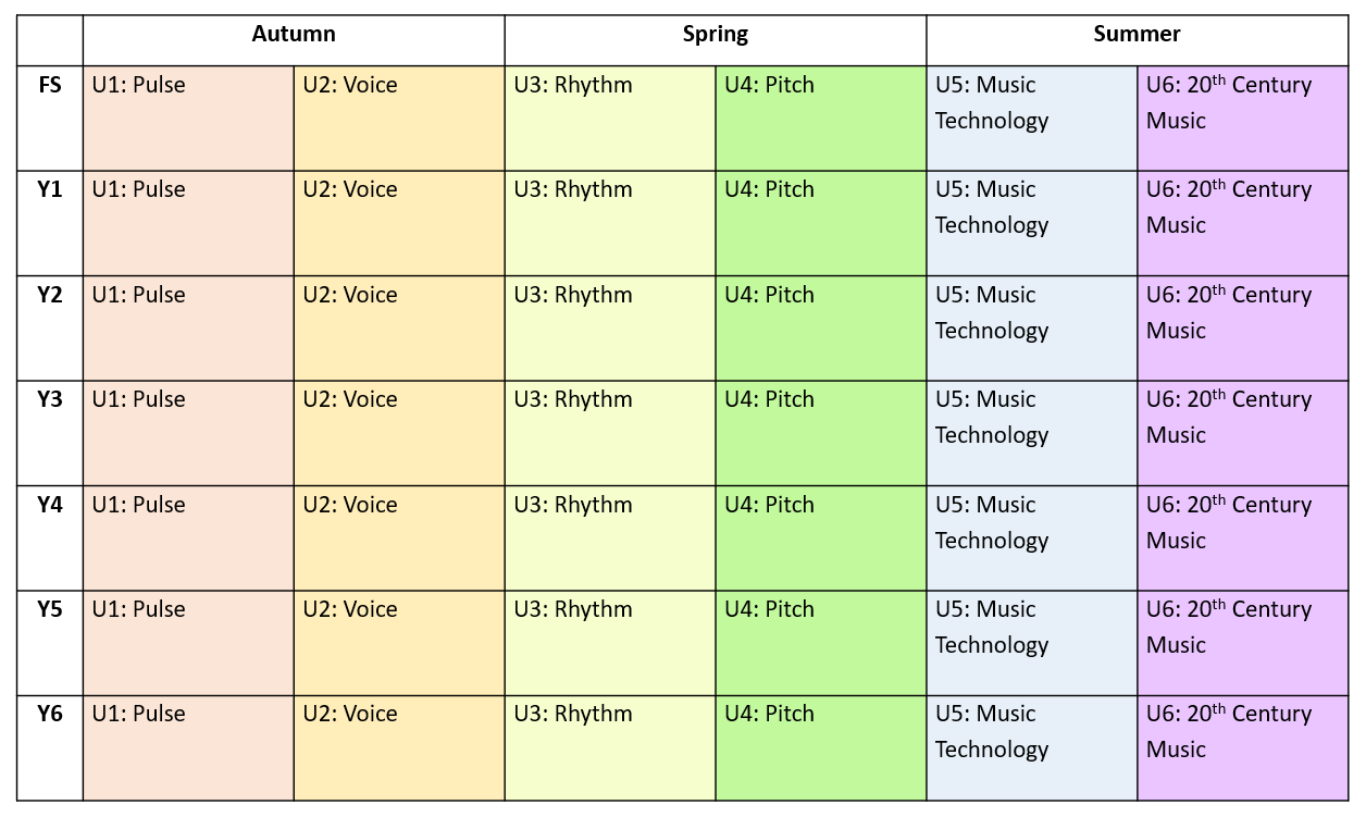 Music is taught using the Leicestershire Music Primary Scheme of work. The year is split into 6 units that are the same from foundation up to year 6. Each year the children complete units on Pulse, voice, rhythm, pitch and music technology. This structure allows children to build upon the previous year’s learning as concepts are embedded and built upon as they progress up the school. Music history is taught throughout these units as children have the chance to listen to classical music and songs which develop their understanding of these 5 units. This is supported by a sixth unit looking at a range of artists and styles of music from the 20th century. The pupils have the opportunity to review the music they hear and are encouraged to share their opinions as to why they do or don’t like a certain piece they have heard.